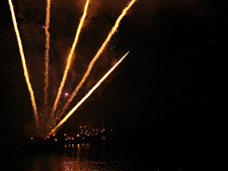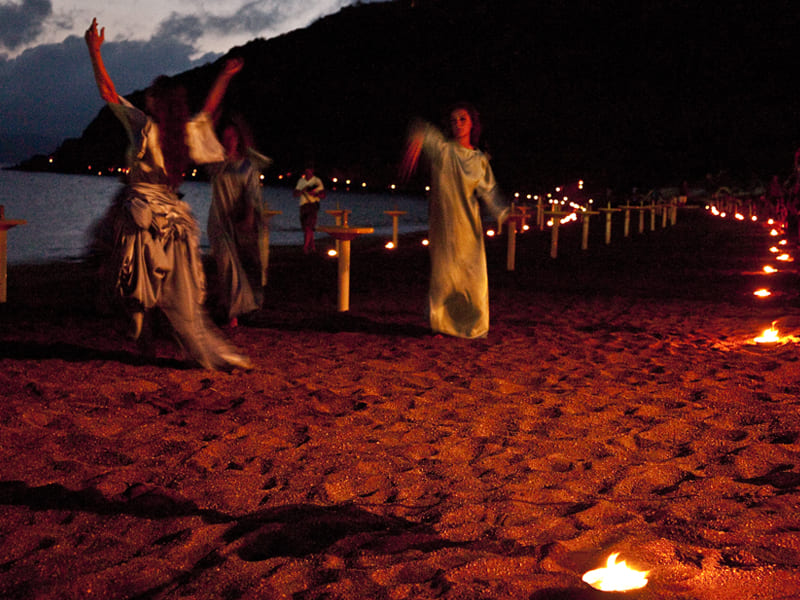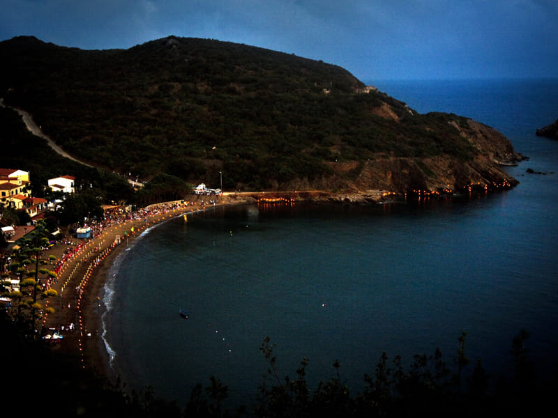 At nightfall the beach is lit by a thousand flashlights, the church bells announce the torchlight procession, and the procession begins; the four Rioni Baluardo, Fortezza, Fosso and Torre parade through all the streets of the town, anticipated by the nobles, led by Count Domingo Cardenas and his wife Isabel Martorèl.