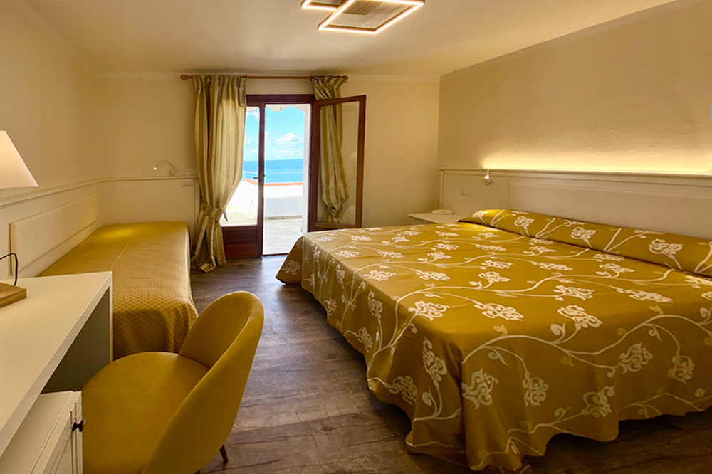 Camera tripla da 20 mq. con terrazza vista mare, mini frigo, climatizzatore, televisore e telefono e terrazza.